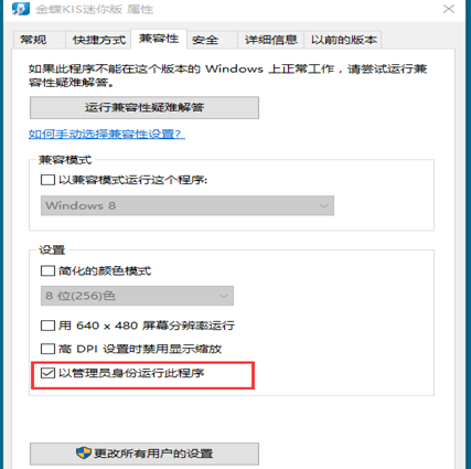 如果需要使用普通管理員用戶登錄操作系統(tǒng)使用金蝶軟件,請選擇桌面金蝶圖標,鼠標右鍵,屬性,兼容性,勾選“以管理員身份運行此程序”,確定,打開軟件,選“是”